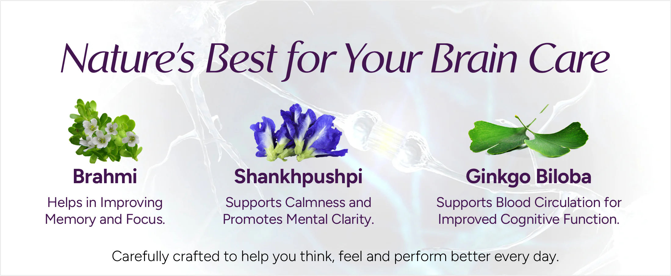 The potent combination of Brahmi, Shankhpushpi, and Ginkgo Biloba helps improve alertness, focus, memory, and overall brain functioning, making it an effective brain tonic for all ages. -