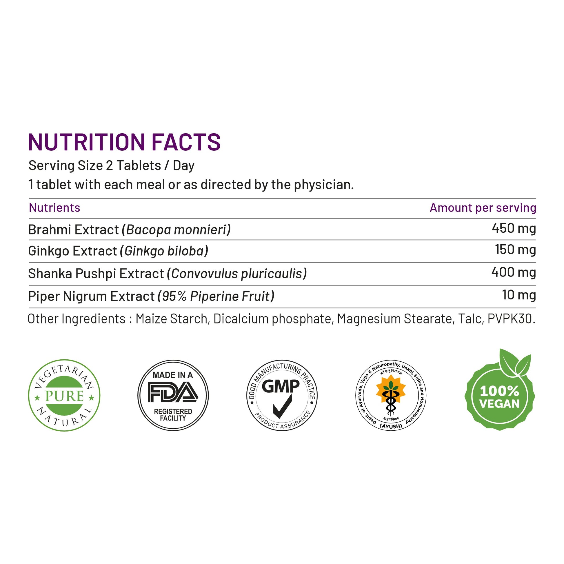 Fortified with BioPiperine, this supplement ensures the highest bio-availability and absorption of its natural ingredients, maximizing the effectiveness of Ginkgo Biloba, Brahmi tablets, and other components for enhanced brain function. -