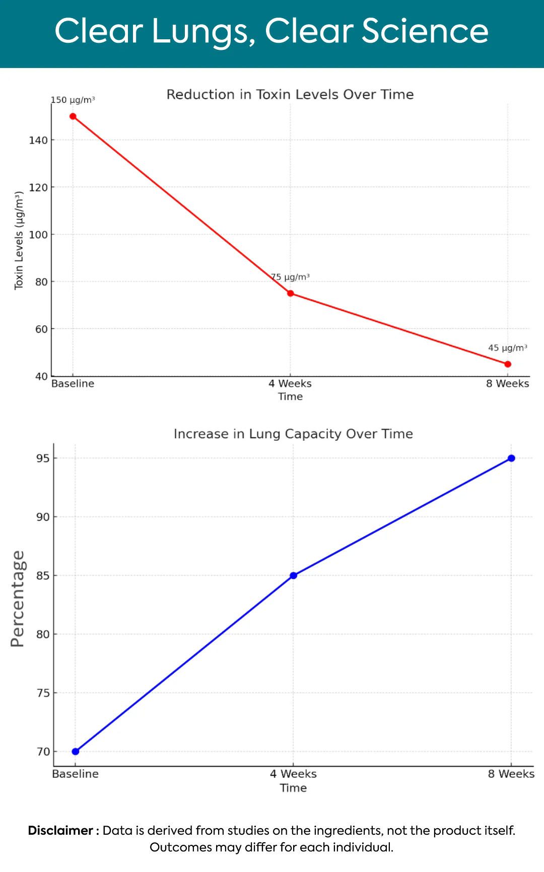 This supplement helps cleanse the lungs by flushing out toxins, clearing mucus, and reducing inflammation. Key ingredients like Vasaka and Arjuna work to enhance lung capacity, while Curcumin and Beetroot help improve oxygen delivery and protect lung tissues from oxidative stress.